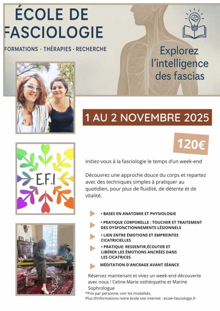 1 & 2 Octobre – Journée découverte de la fasciologie Posted on octobre 9, 2025octobre 9, 2025 Une journée découverte dédiée à la fasciologie, visant à explorer l’influence des cicatrices sur le corps et les émotions. Cette initiation permet de mieux comprendre comment les traces physiques laissées par une intervention, une blessure ou un choc peuvent impacter la posture, la mobilité et même l’équilibre émotionnel. Réservation jusqu’au 22 octobre, au 06.38.87.01.98